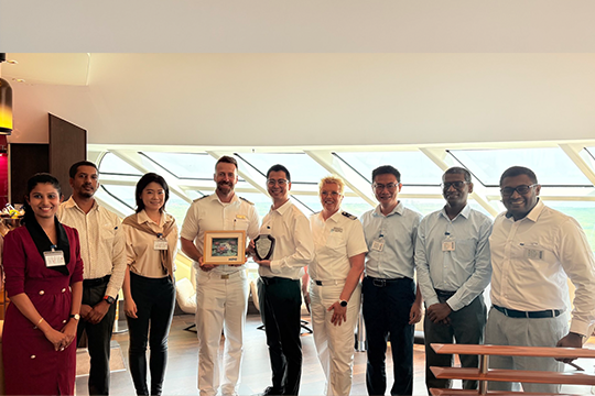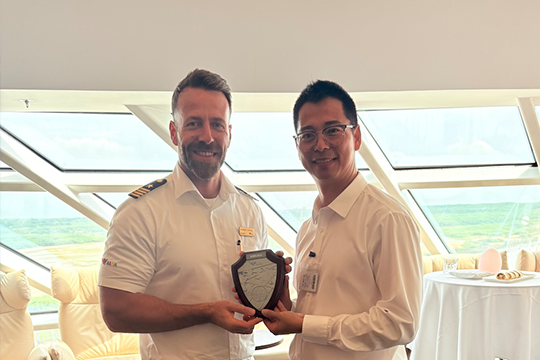 Captain of the AIDAdiva Master Michael Schmid exchanging tokens with HIPG Chief Operations Officer Tommy Yang to make the liner’s maiden call