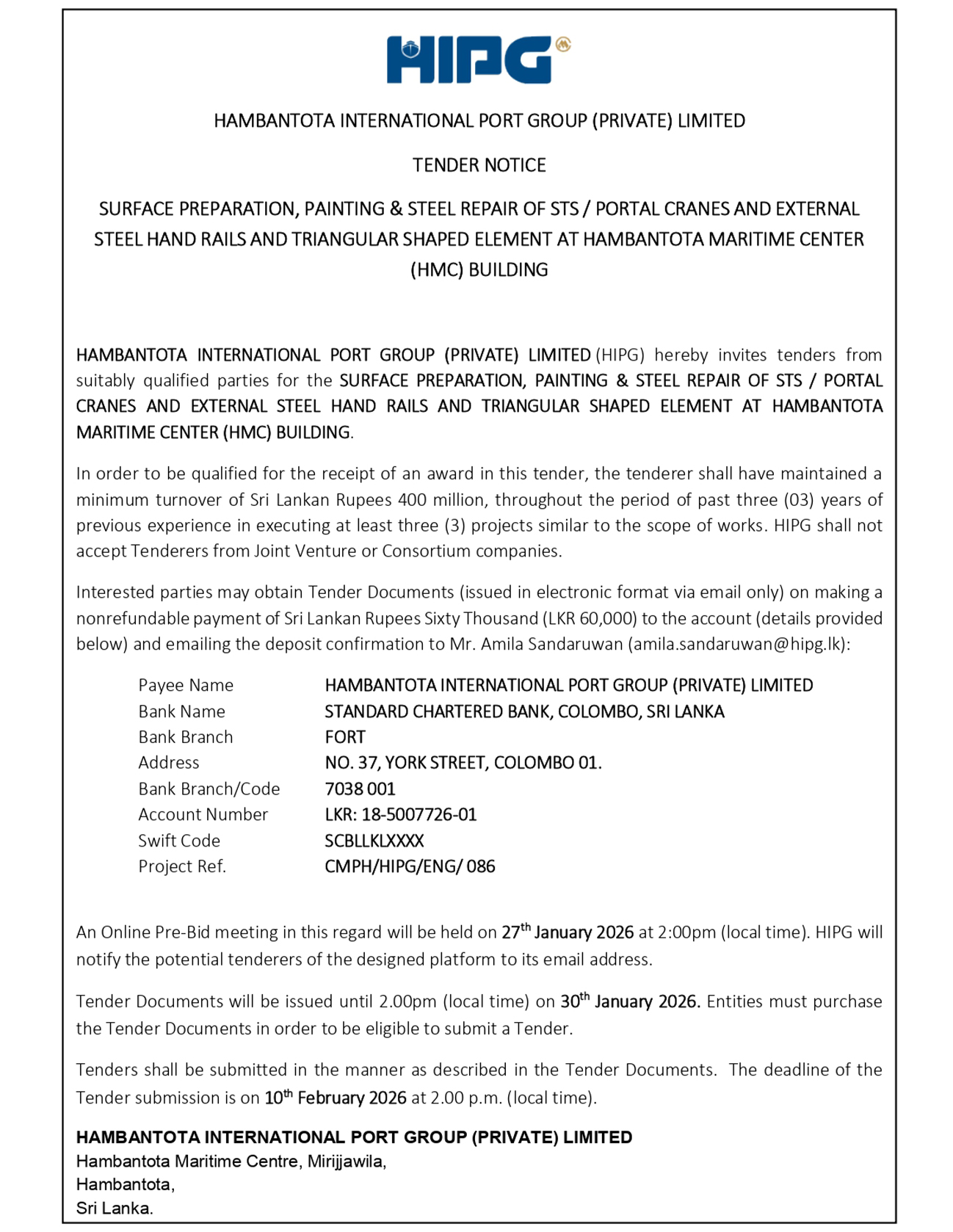 SURFACE PREPARATION, PAINTING & STEEL REPAIR OF STS / PORTAL CRANES AND EXTERNAL STEEL HAND RAILS AND TRIANGULAR SHAPED ELEMENT AT HAMBANTOTA MARITIME CENTER (HMC) BUILDING