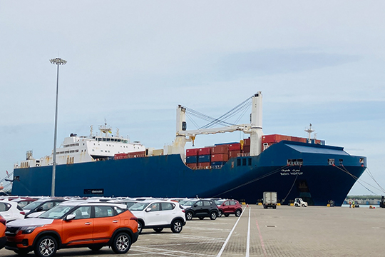 RORO vehicles in the yard and Multipurpose vessel MV Bahri HOFUF berthed at Hambantota International Port.
