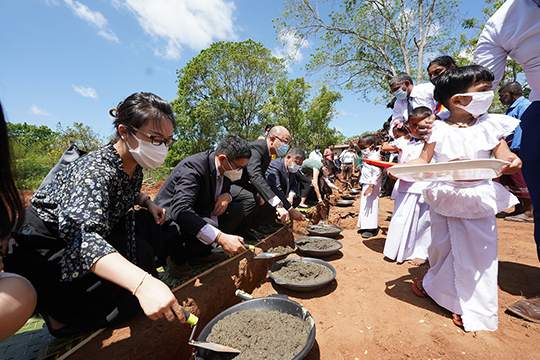 Ambassador for China to Sri Lanka Qi Zhenhong, who was Chief Guest at the foundation laying ceremony held at the project site, was greeted by Johnson Liu, CEO of HIPG. The Management team of the Hambantota International Port, representatives of Colombo International Container Terminal (CICT) and the Nirmala Foundation also participated in the event. Galapitagala Premarathana Thero, Chief Incumbent of the Kandagasmankada Rajamaha Viharaya; Chinese Ambassador Qi Zhenhong; Johnson Liu, CEO HIPG; Jack Huang, CEO CICT; Tissa Wickramasinghe, COO HIPG; Raymond Mu, CFO HIPG; Ravi Jayawickreme, CEO HIPS; representatives from Divisional and District Secretariats; C. Wickramaratne, OIC Lunugamwehera Police Station, along with senior staff of HIPG and residents of the village took part in breaking ground at the site, to lay the foundation for the project.