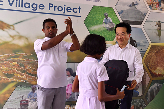 Distribution of school supplies to the school children of Kandagasmankada Primary School by CMG Chairman Miao Jianmin. Also in the picture is Nirmala Foundation Chairman, Indika Abeywardhana.